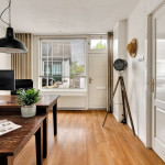 De sfeervolle lichte woonkamer met grote ramen heeft een doorgang naar de woonkeuken en werkkamer (voormalig slaapkamer). Bijna de gehele begane grond is voorzien van Balterio laminaat met houten toplaag.