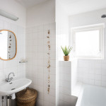 De lichte badkamer is voorzien van een bad met douche en een wastafel.