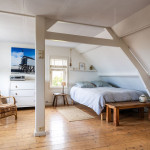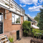 Via de afgesloten trapopgang, welke de keuken van de woonkamer scheidt, kom je op de eerste verdieping. Op de eerste verdieping zijn twee slaapkamers (voorheen 3) en de ruimte is eenvoudig naar wens in te delen . De grote slaapkamer is voorzien van een wastafel en geeft ook toegang tot het prachtige dakterras van 29m2 op het zuiden.